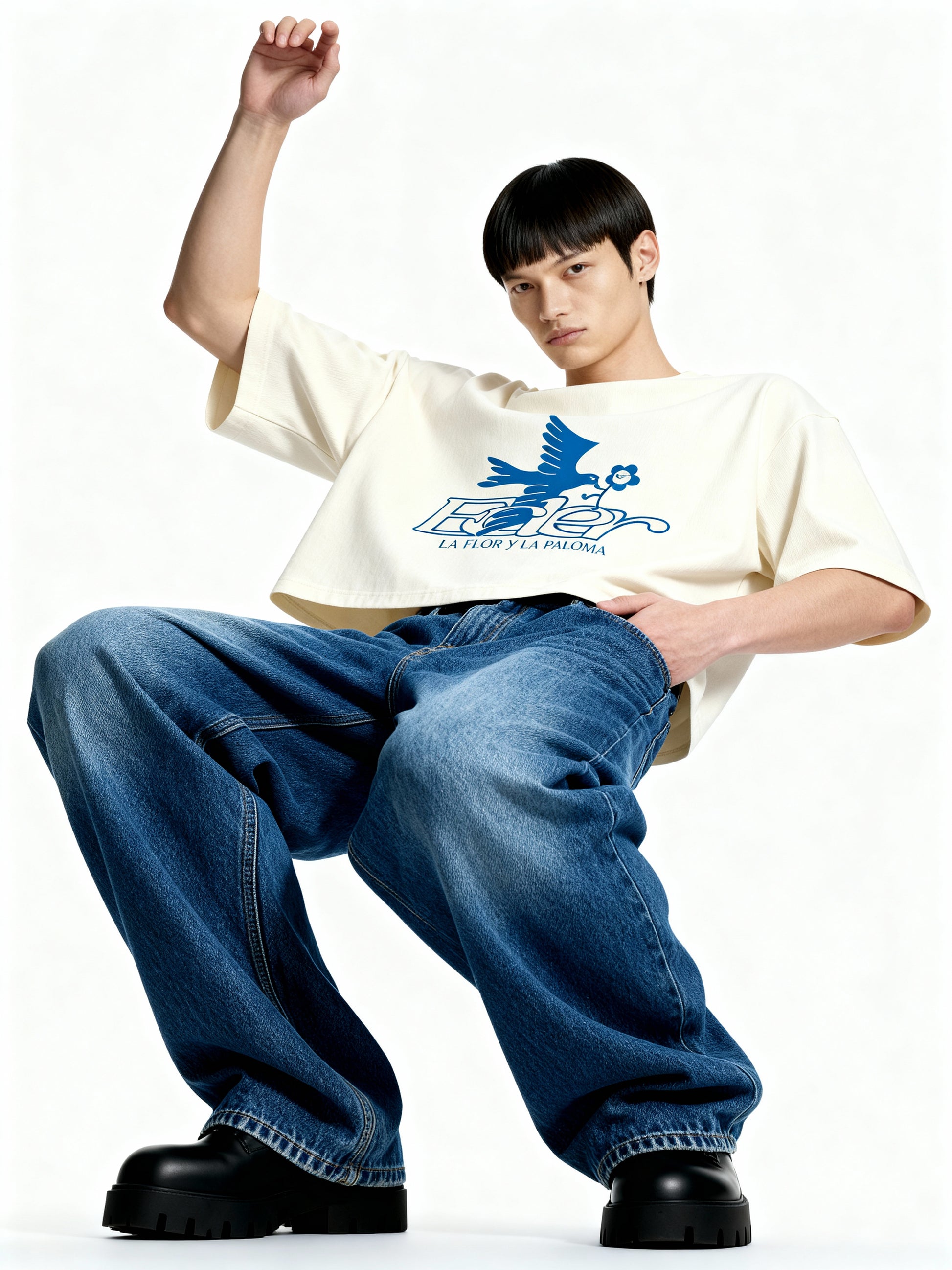 Segunda versión en azul de la camiseta del segundo capítulo de "La Flor y la Paloma".